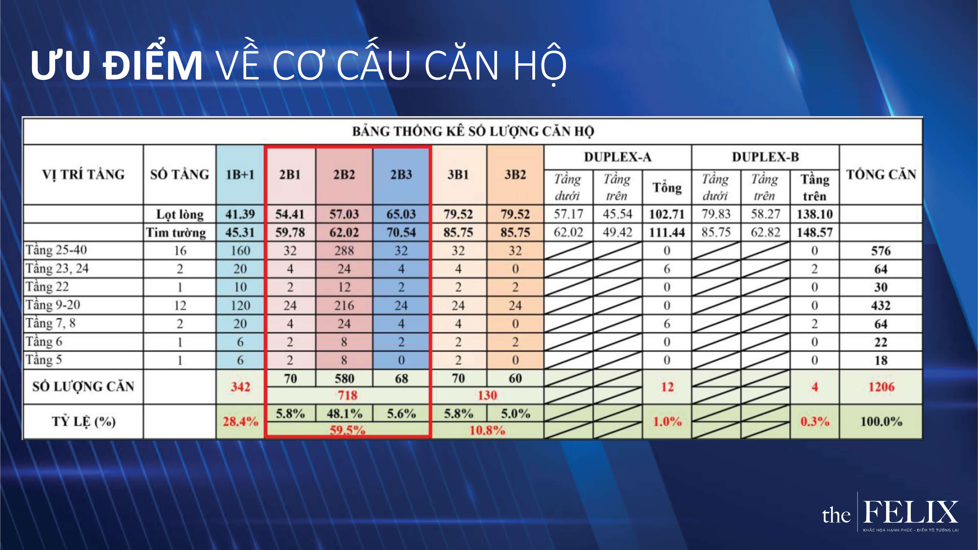 Tổng số lượng căn hộ The Felix Thuận An cung ứng ra thị trường 1.206 căn hộ, diện tích căn hộ thương mại dao động từ 45m2 đến 86m2, diện tích Duplex dao động từ 102m2 đến 149m2. Các sản phẩm được phân bổ theo tầng cụ thể: