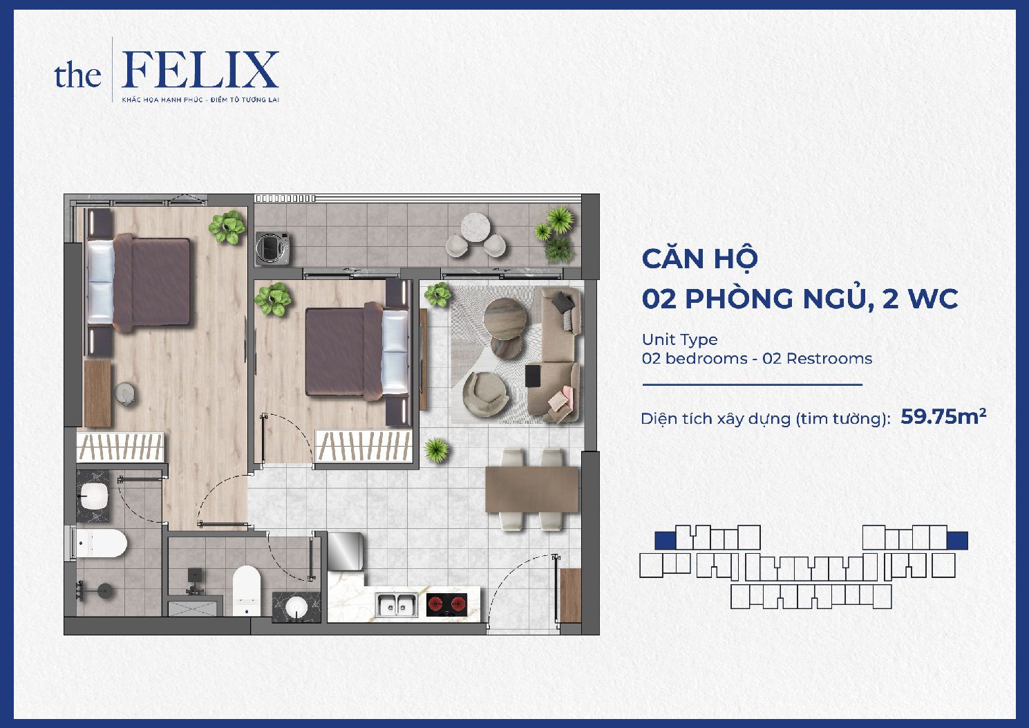 Căn hộ 2 phòng ngủ 2WC: Căn hộ The Felix cung cấp nhiều thiết kế và lựa chọn với 2 loại diện tích căn hộ 2 phòng ngủ từ 59.75m2 – 61.85m2 – 70.20m2. Dòng sản phẩm 2 phòng ngủ được chủ đầu tư cung ứng 718 căn hộ, nhằm phục vụ nhu cầu cho các gia đình trẻ có con nhỏ