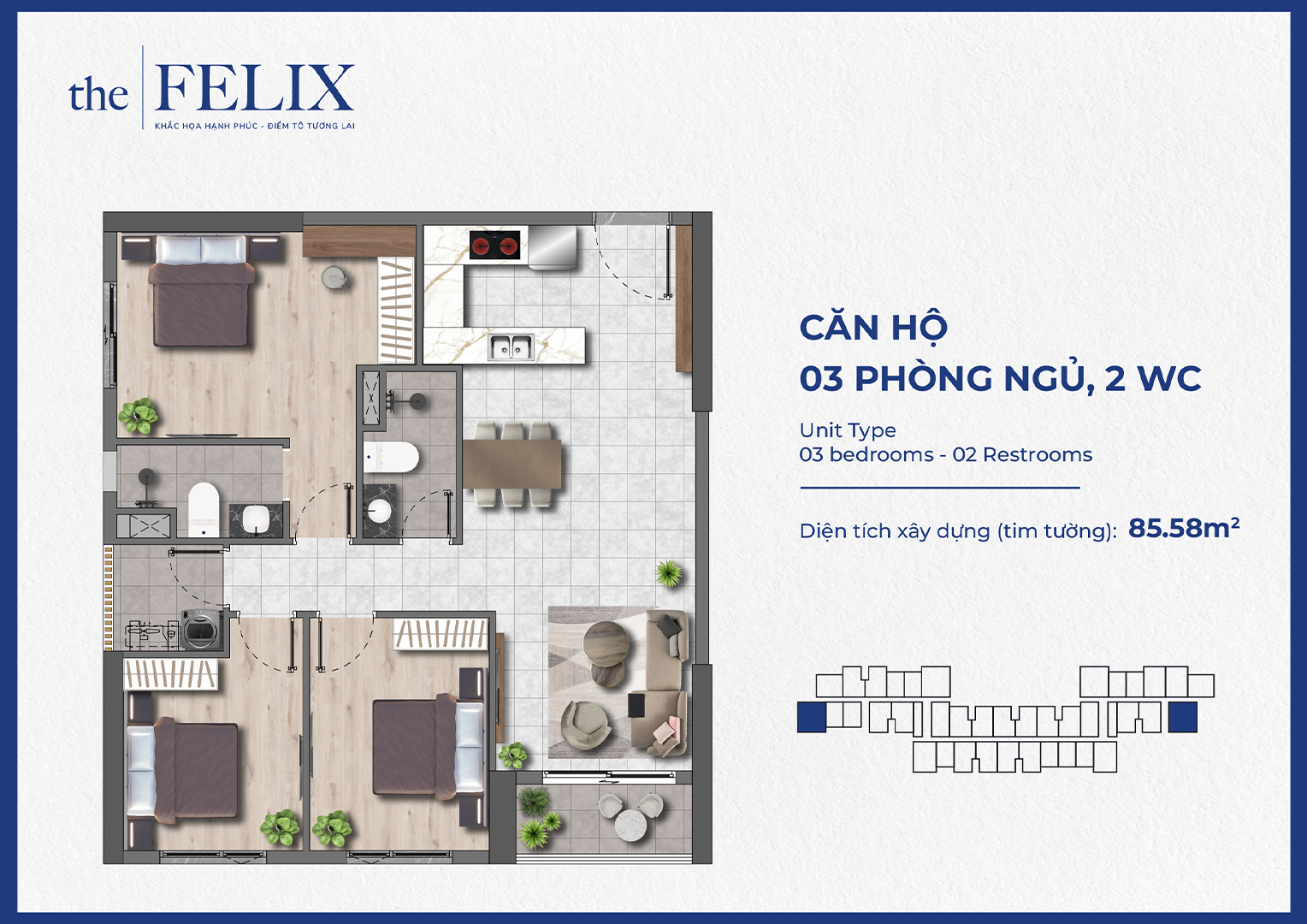 Căn hộ 3 phòng ngủ 2WC: Với loại căn hộ rộng rãi 3 phòng ngủ, The Felix cung ứng ra thị trường 130 sản phẩm với 2 dạng thiết kế. Đây là dòng căn hộ dành cho các gia đình đa thế hệ nhằm tạo không gian thoải mái và tiện nghi cho cuộc sống