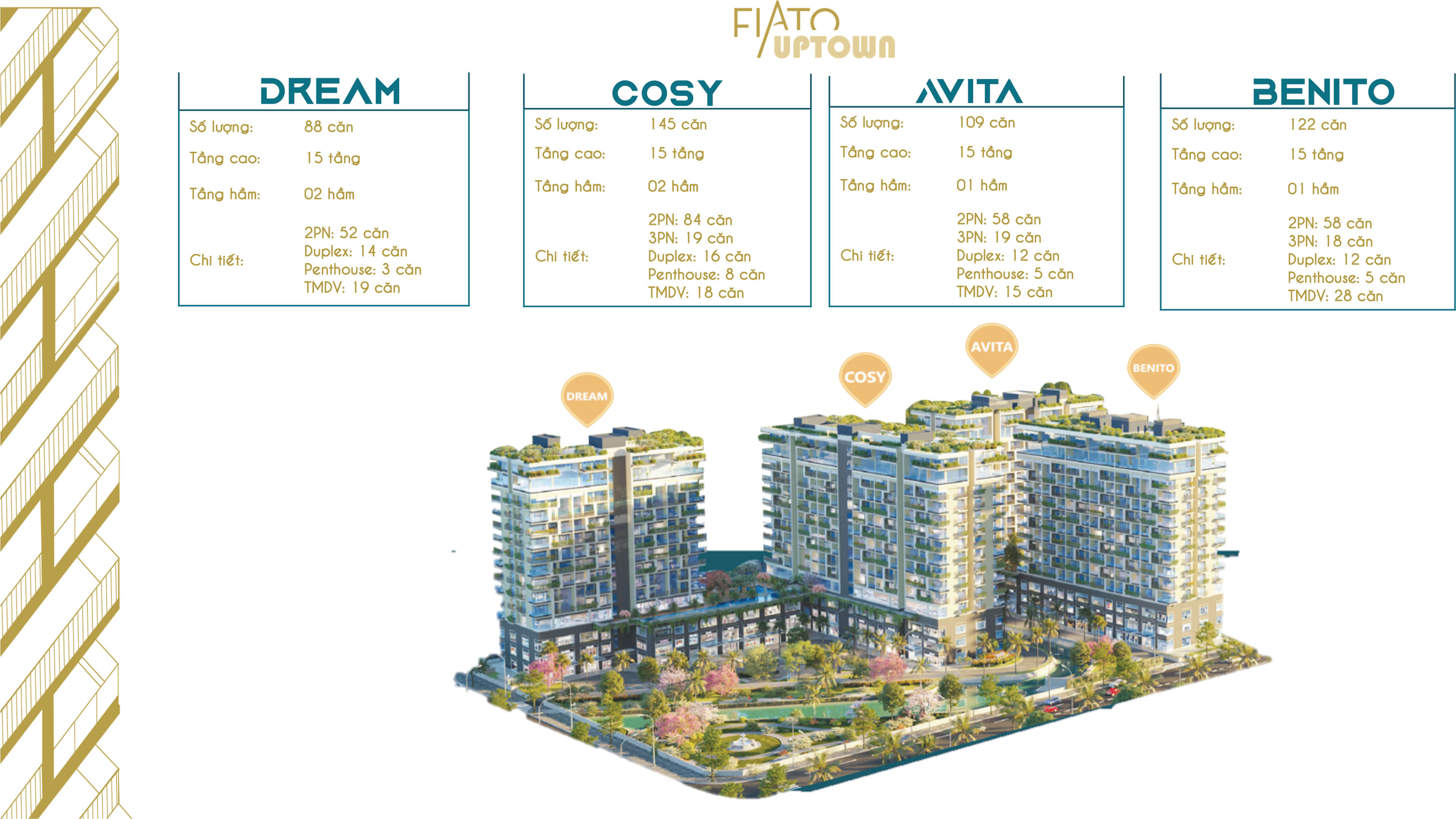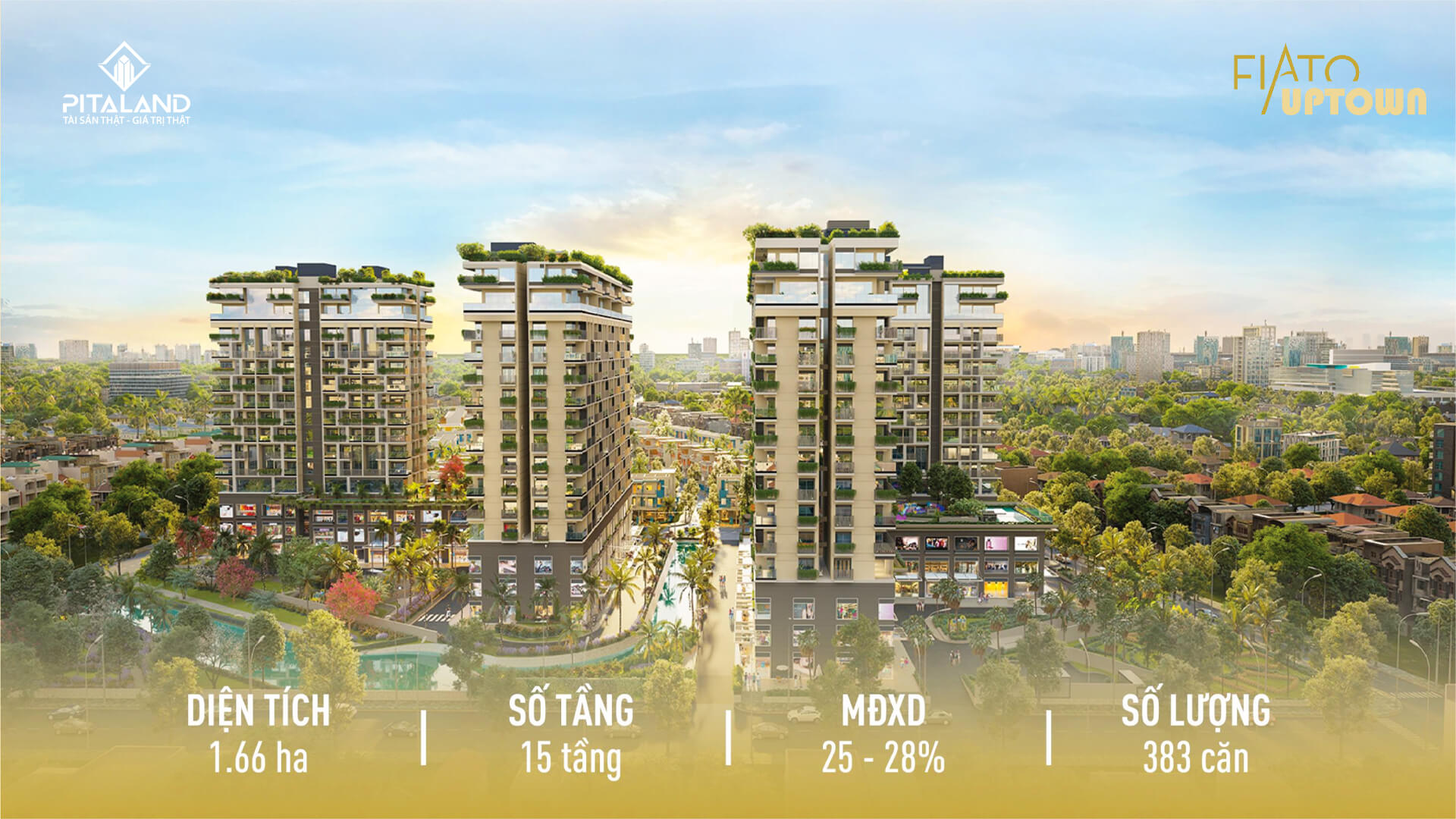Căn Hộ Fiato Uptown được xây dựng trên tổng diện tích 16.592 m2, bao gồm 4 block căn hộ cao 15 tầng và dự án cung ứng ra thị trường khoảng 383 căn hộ, bao gồm 2 dòng sản phẩm căn hộ và Shophouse thương mại. Đặc biệt Fiato Uptown được thiết kế với mật độ chỉ 28%, nhằm tạo một chốn an cư với mảng xanh thoải mái, yên tĩnh, gần gũi với thiên nhiên cho cư dân dự án, một nơi vô cùng chú trọng vào sức khỏe con người giữa lòng thành phố