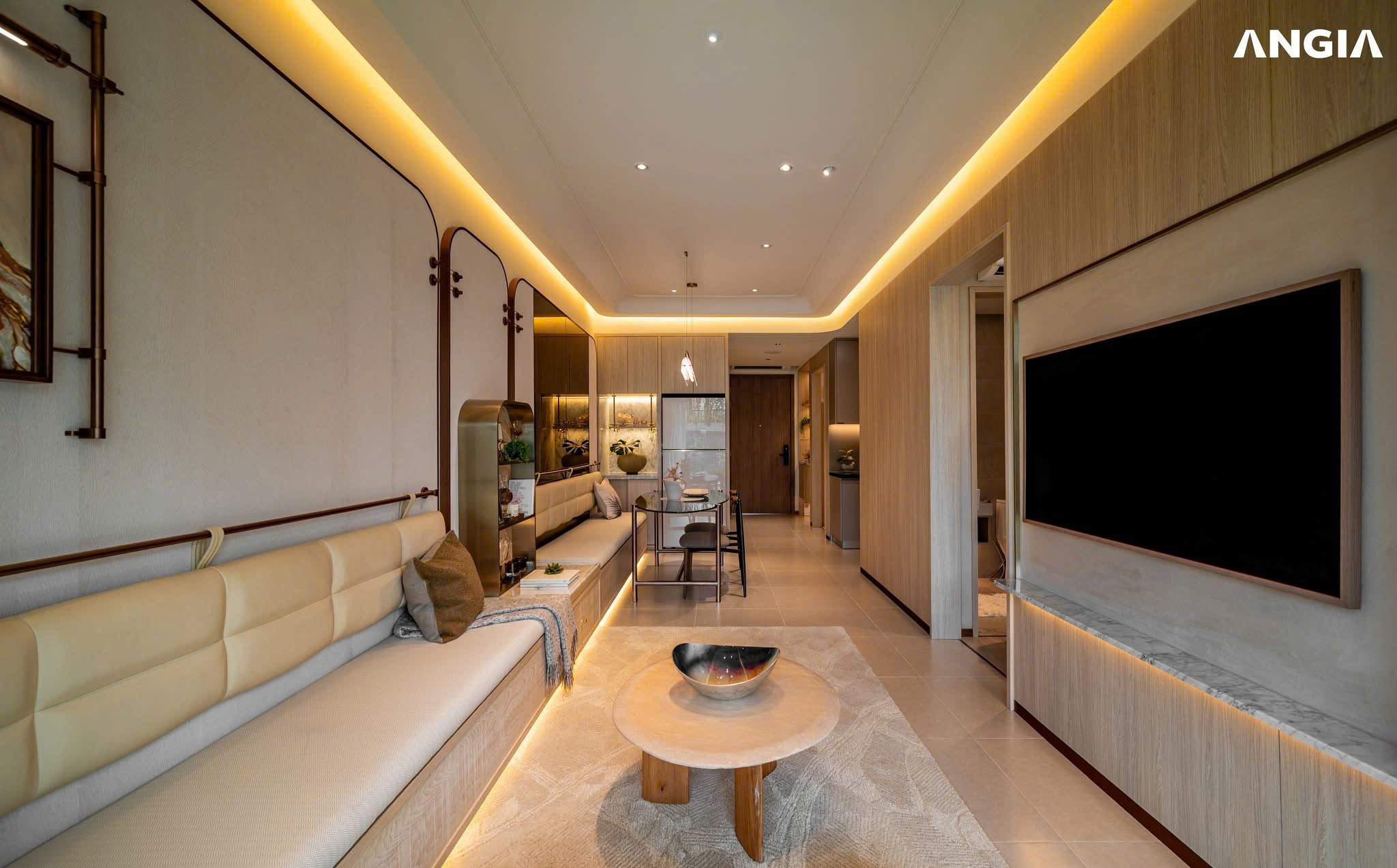 Bản Giao Hưởng Màu Sắc & Vật Liệu Cao Cấp Tông màu chủ đạo của căn hộ là những sắc trung tính như trắng, be và xám, được xử lý khéo léo nhằm giữ sự tinh tế mà không hề đơn điệu. Các vật liệu nội thất như gỗ tự nhiên, đá cẩm thạch và kim loại ánh đồng hòa quyện để tạo nên một bản giao hưởng hài hòa giữa hiện đại và truyền thống. Từng món nội thất không đơn thuần là một món đồ – nó là tuyên ngôn về gu thẩm mỹ và sự chỉn chu của gia chủ.