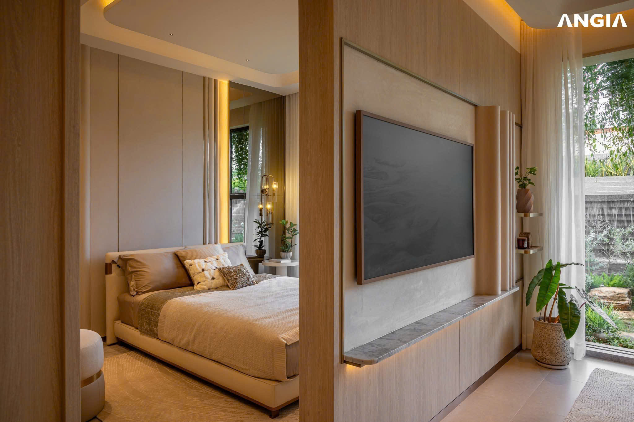 Phòng ngủ chính được bài trí tối giản mà sang trọng, với vật liệu cao cấp như da, ánh kim và ánh sáng dịu nhẹ.