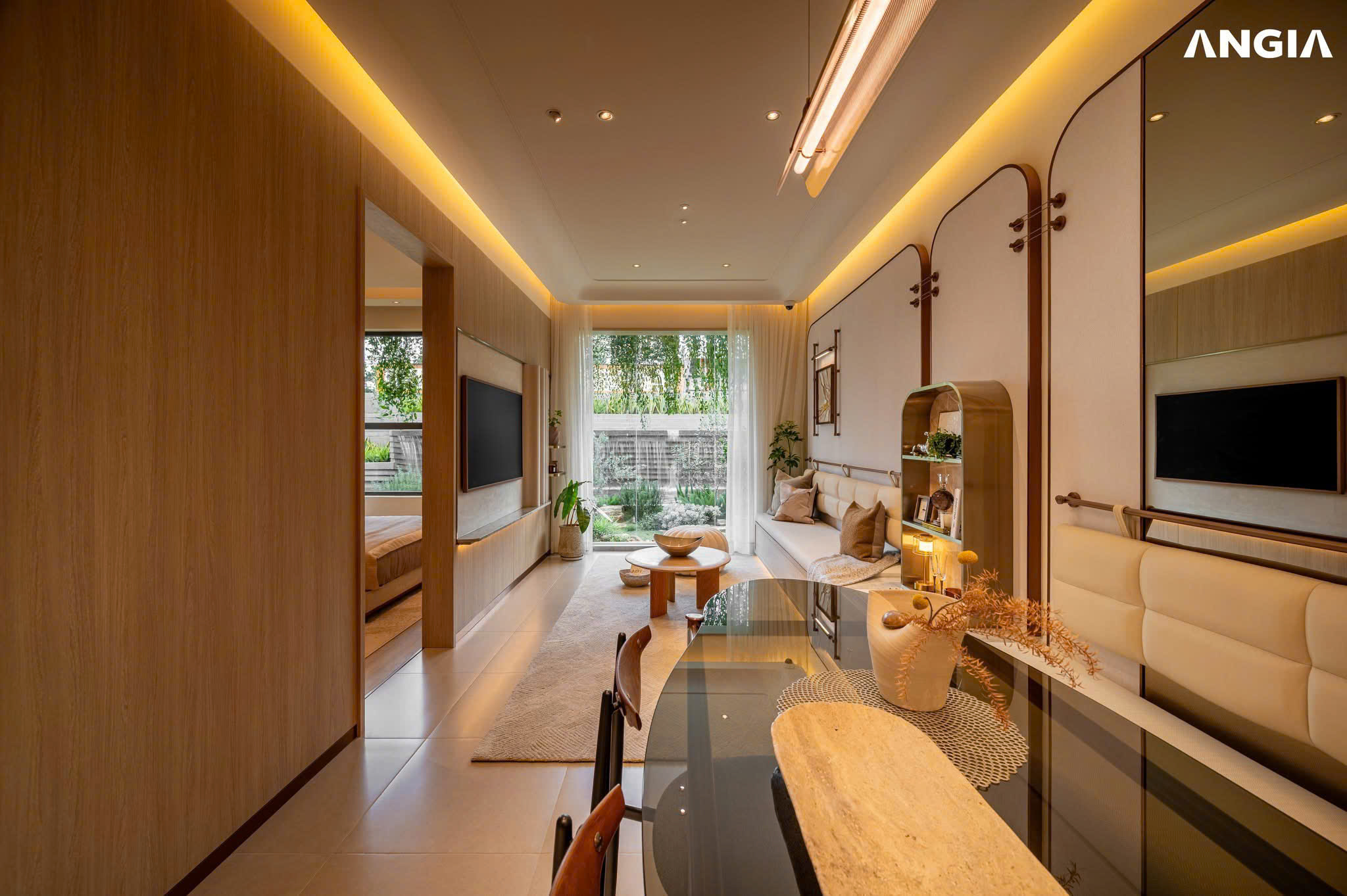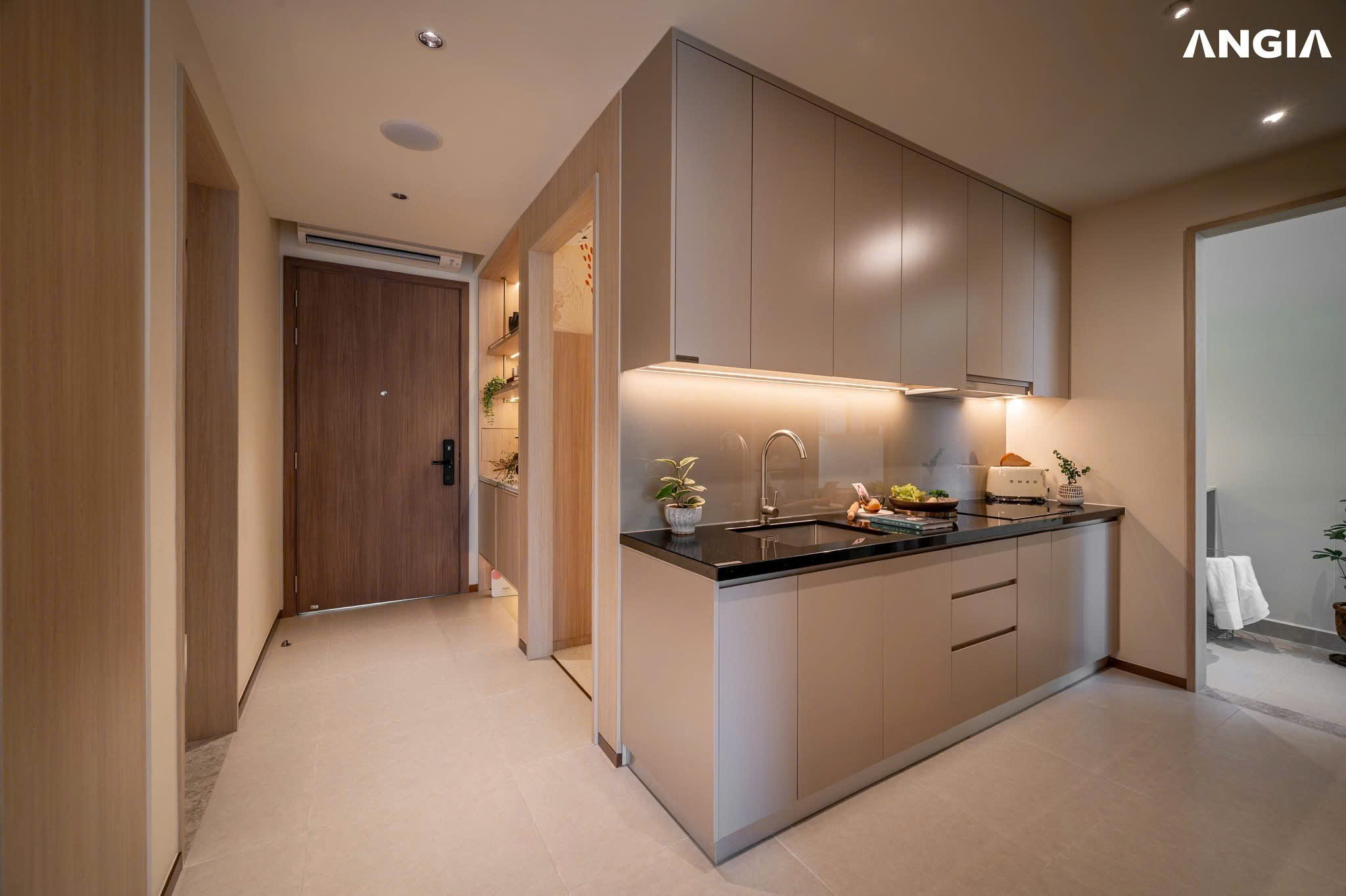 Căn hộ được thiết kế với lối kiến trúc mở, đón nắng và gió tự nhiên một cách tối ưu. Dù sở hữu diện tích 65m² vừa vặn, không gian không hề tạo cảm giác chật hẹp nhờ cách bố trí khoa học, tinh giản và ưu tiên sự kết nối giữa các khu vực chức năng.