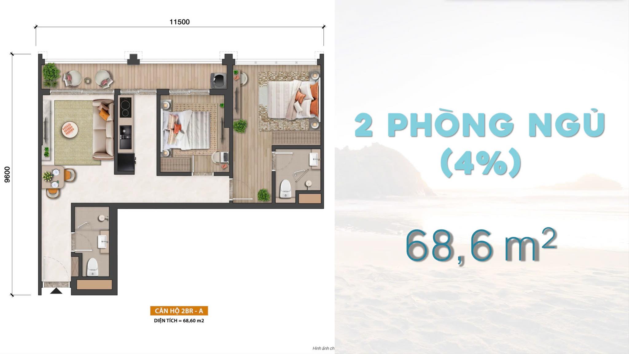 • 2 phòng ngủ: 61 – 68m² (chiếm 18%)