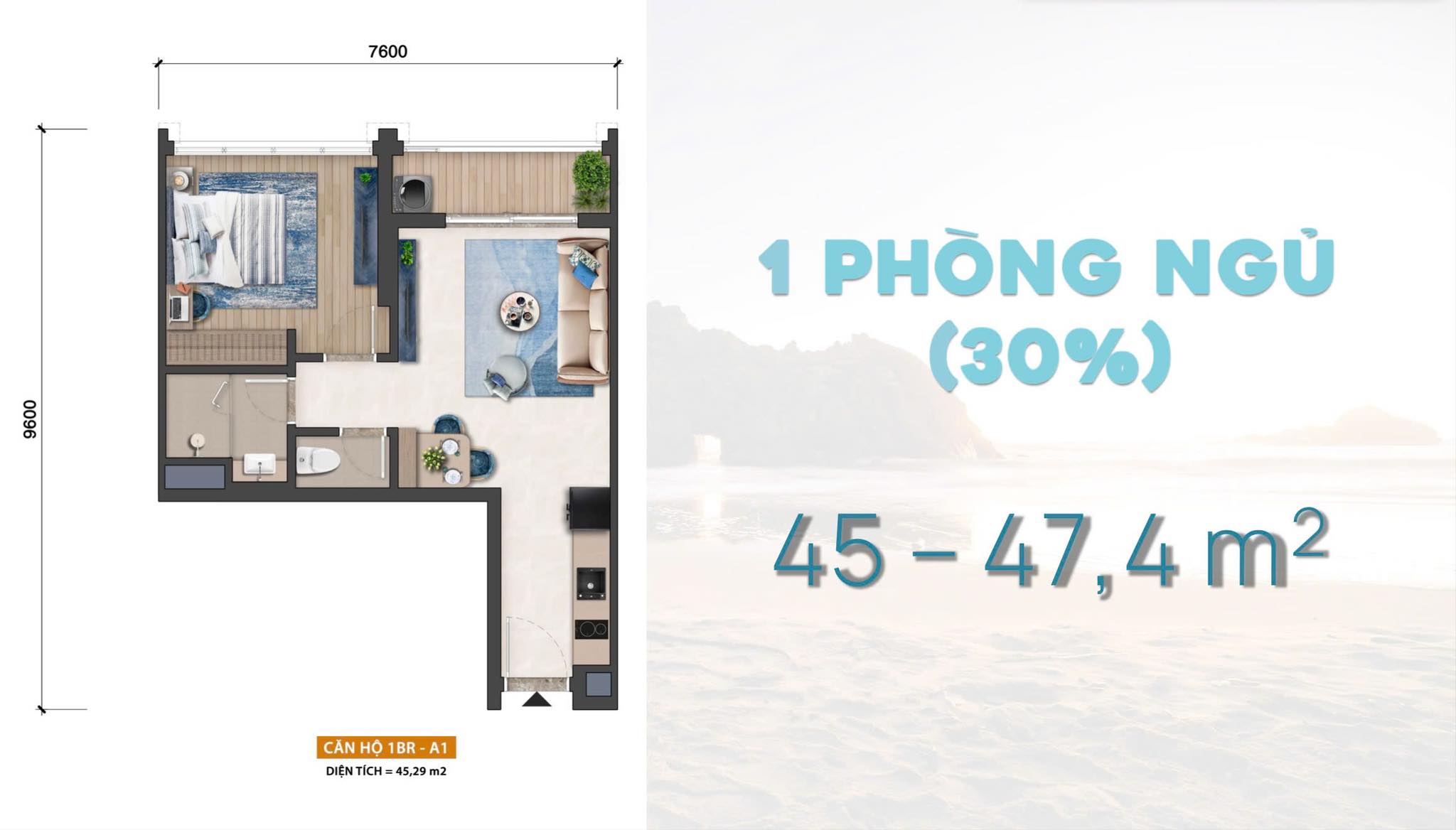 • 1 phòng ngủ: 45 – 47,4m² (chiếm 30%)