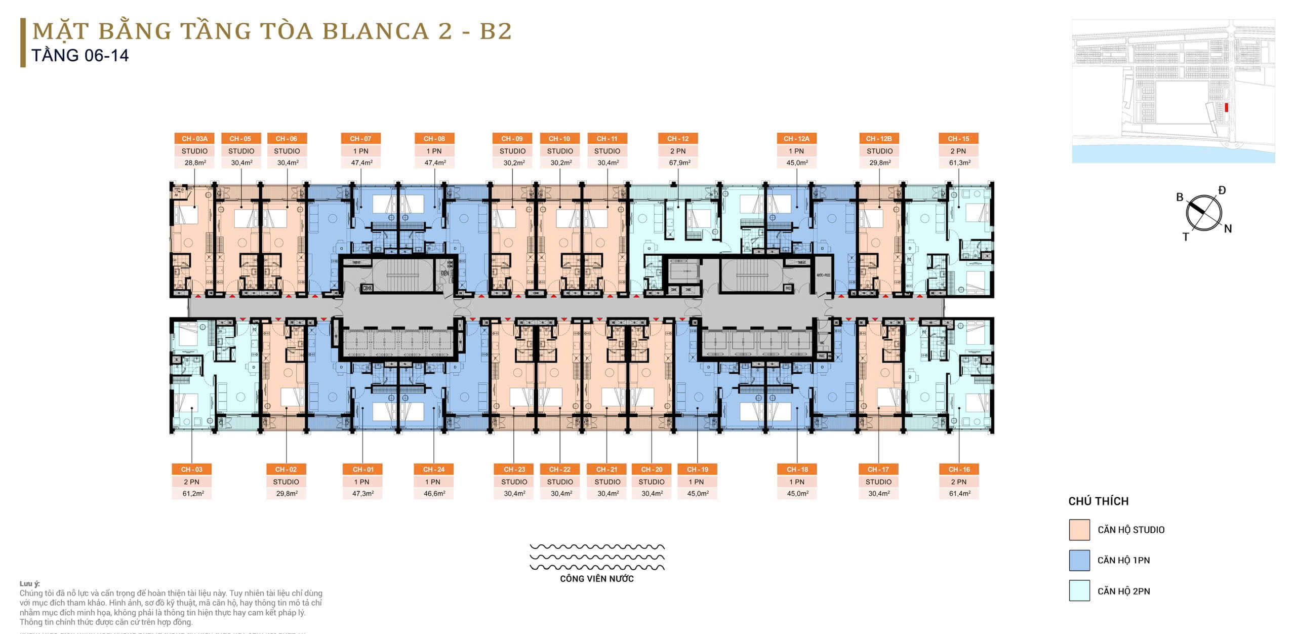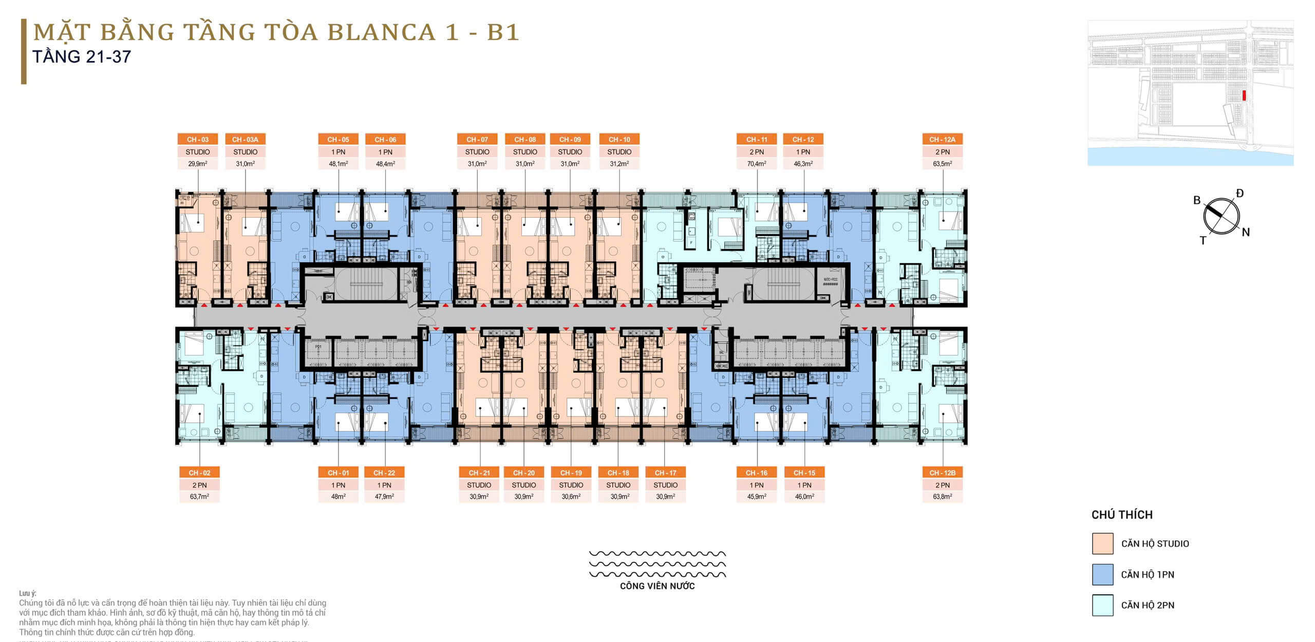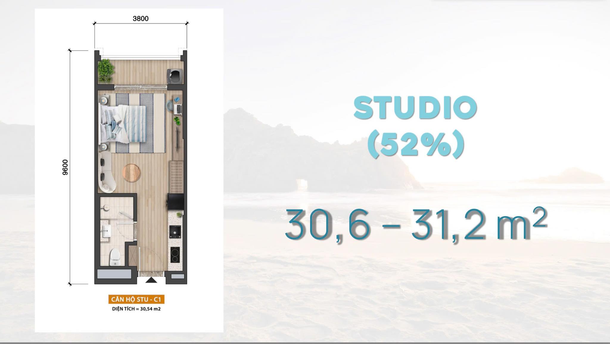 • Studio: 30,6 – 31,2m² (chiếm 52% tổng số căn hộ)