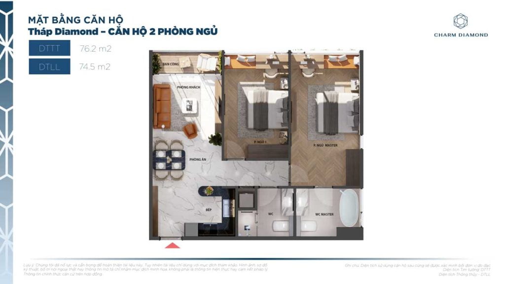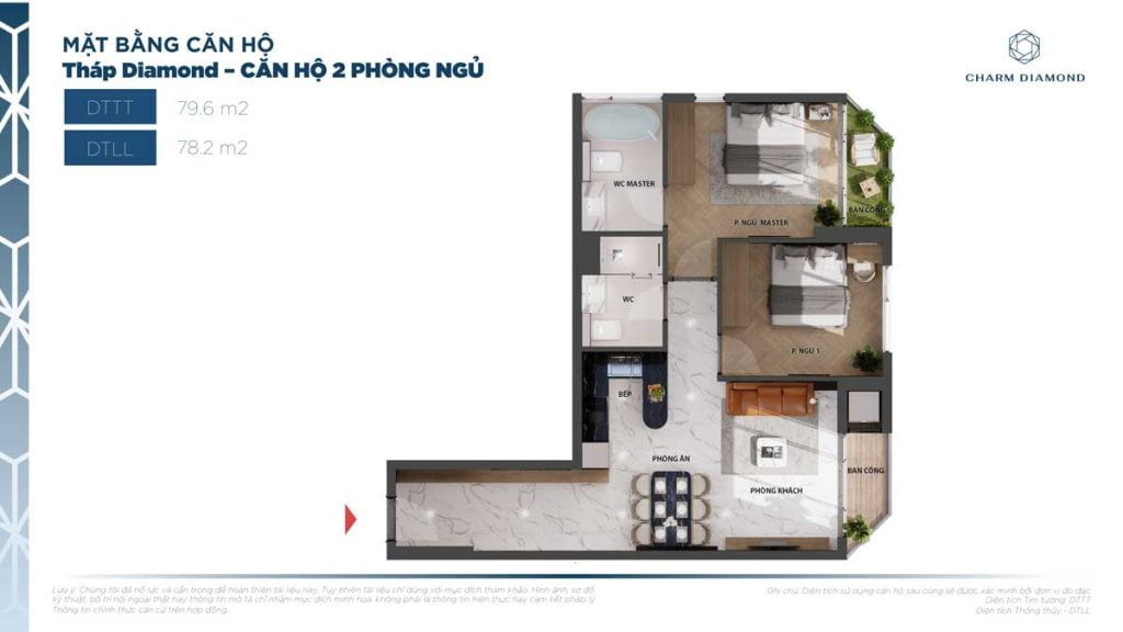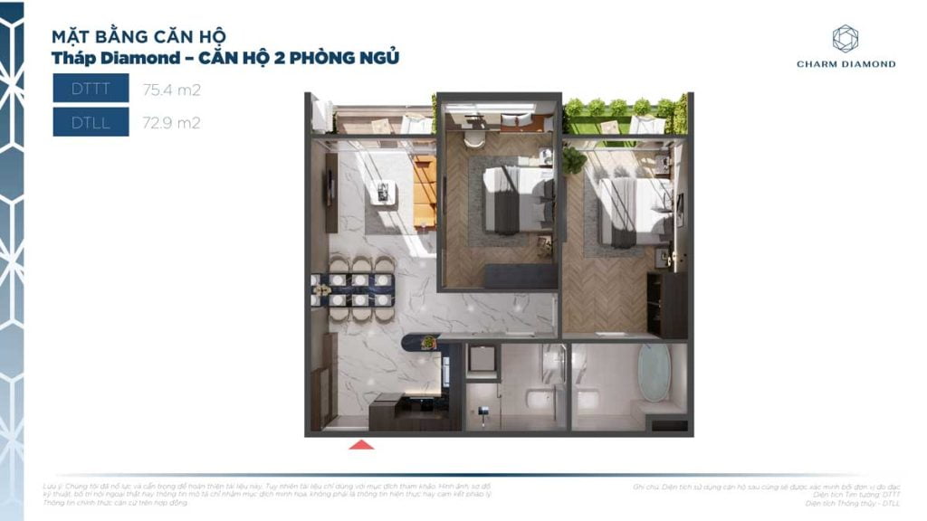 Diện tích căn hộ 2 Phòng ngủ dự án Charm City:
