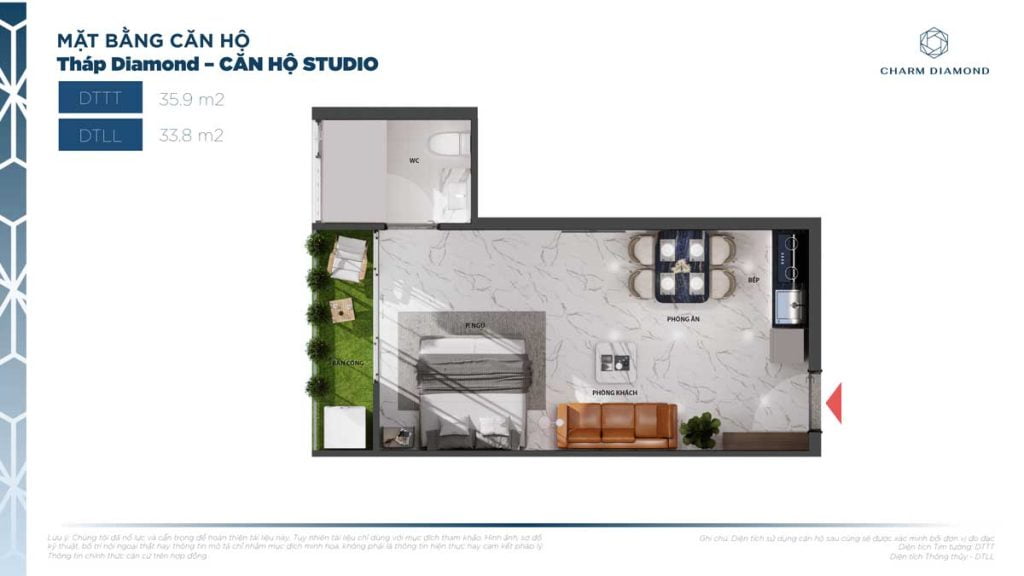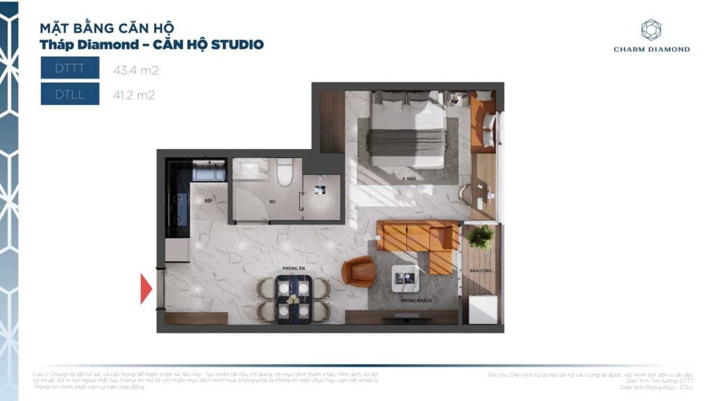 Diện tích căn hộ 1 Phòng ngủ dự án Charm City: