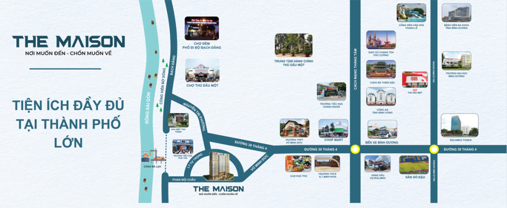 Cách sông Sài Gòn chỉ khoảng 700m, The Maison có thể ngắm nhìn được cảnh quan sông nước và hàng loạt các tiện ích ngoại khu đa dạng như: THPT Võ Minh Đức cách 1.4km, Mầm non Hoa Mai 1.2km, Siêu thị Coopmart Thủ Dầu Một 1.8km, Trường TH An Thanh 2km,…Và hàng loạt các tiện ích dịch vụ nằm liền kề dự án, tạo nên mạng lưới dịch vụ dày đặc, đáp ứng nhu cầu sống và làm việc hằng ngày cho các cư dân.