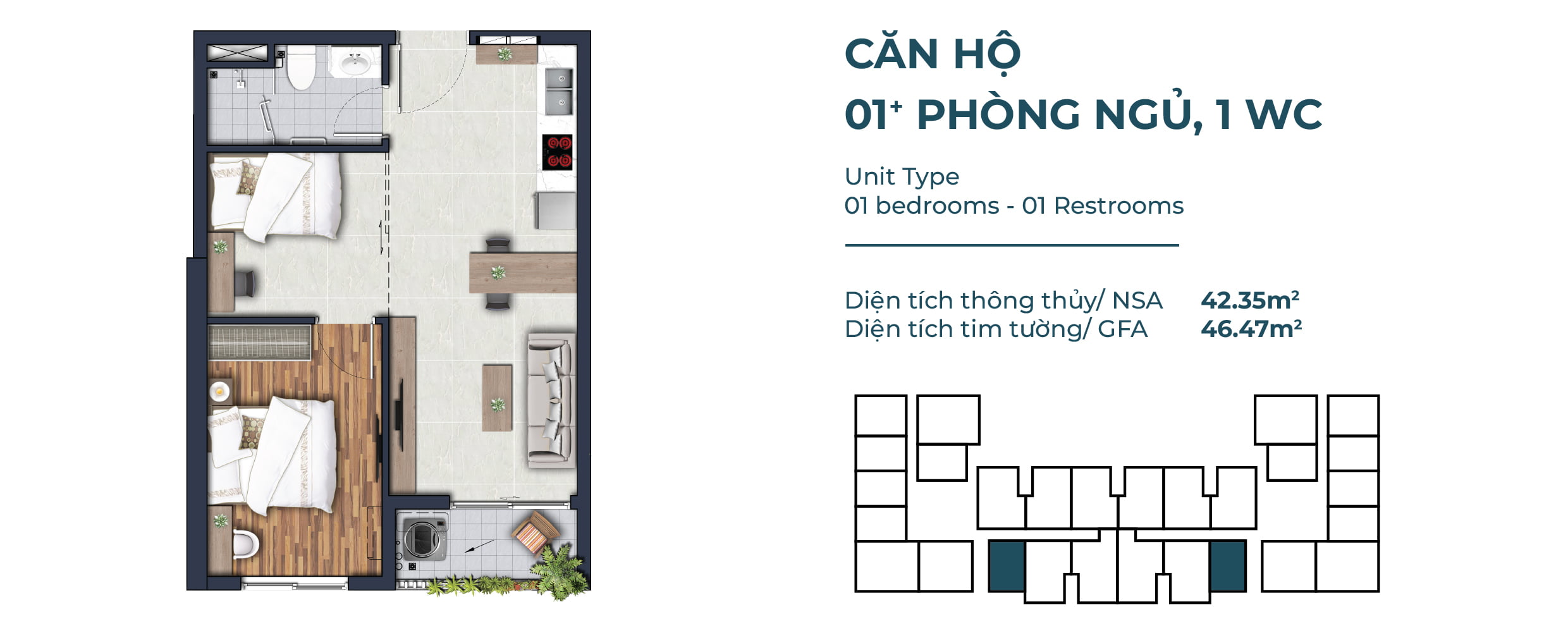 Căn hộ 1 phòng ngủ: 40,18 – 42,35 m2.