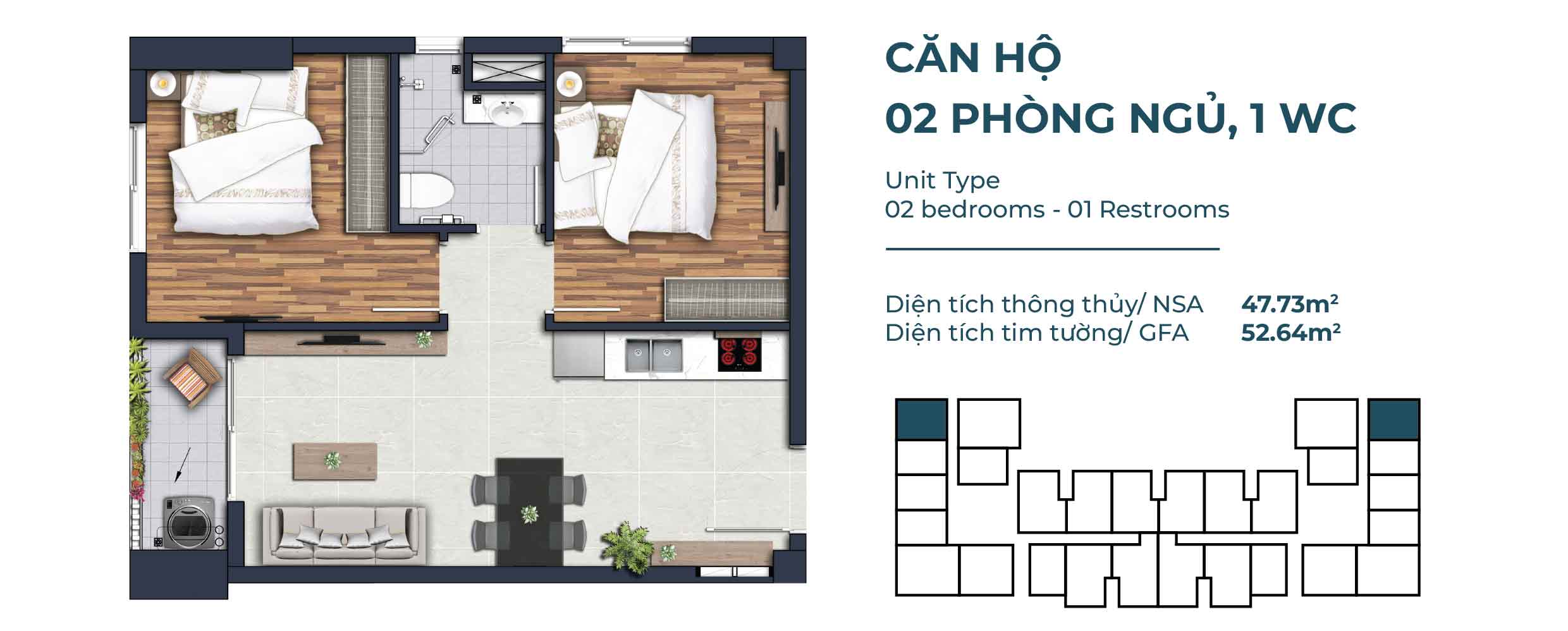 Căn hộ 2 phòng ngủ: 47,73 – 73,28 m2.