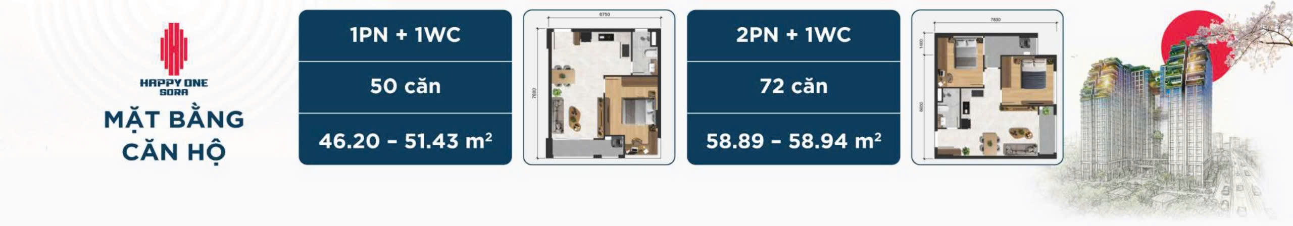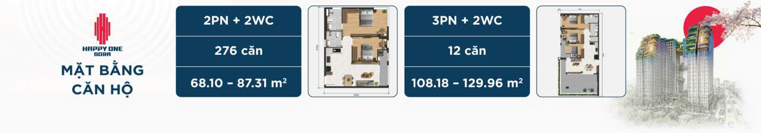 Các căn hộ tại Happy One Sora được thiết kế theo phong cách Nhật Bản, tối ưu không gian sống, đón gió và ánh sáng tự nhiên. Mỗi căn hộ được xây dựng với chất lượng cao cấp và mang lại một không gian sống sang trọng, thoải mái.