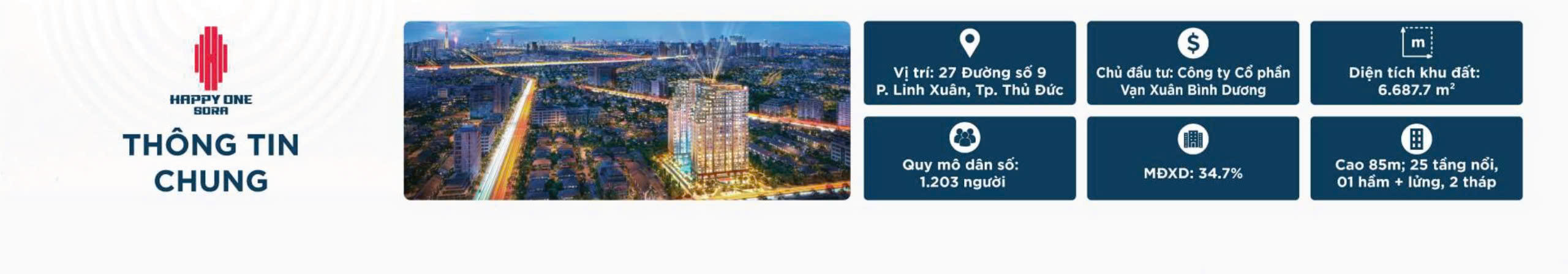 Happy One Sora là dự án căn hộ cao cấp do Vạn Xuân Group phát triển, tọa lạc tại phường Linh Xuân, TP. Thủ Đức. Dự án có diện tích 6.600m², với mật độ xây dựng 34,9%, mang đến không gian sống rộng rãi và thoáng đãng.
