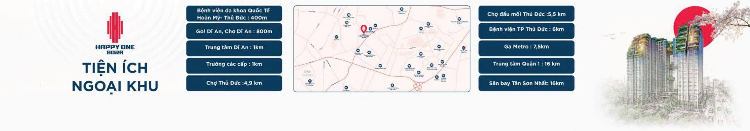 Từ dự ánHappy One Sora, cư dân chỉ cần vài phút di chuyển, bạn đã có thể chạm tay vào nhịp sống hiện đại với hàng loạt tiện ích xung quanh: