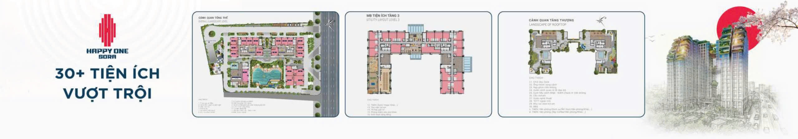 Tiện ích: tiện ích cao cấp phong cấp Nhật với siêu phẩm độc vị cùng “ 4 khu vườn Nhật” trên không tại dự án Happy One Sora và 30+ tiện ích trải dài từ tầng Trệt đến tầng Thượng