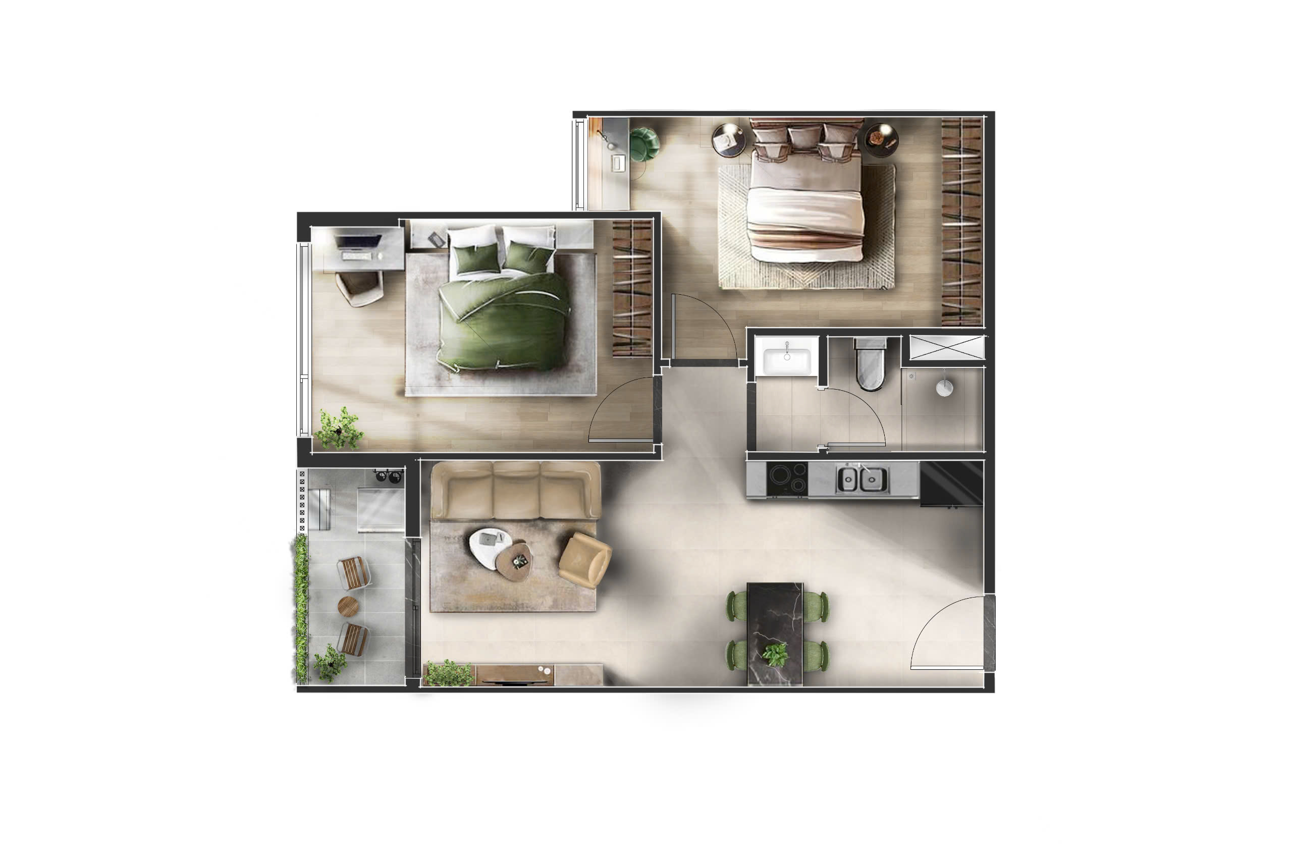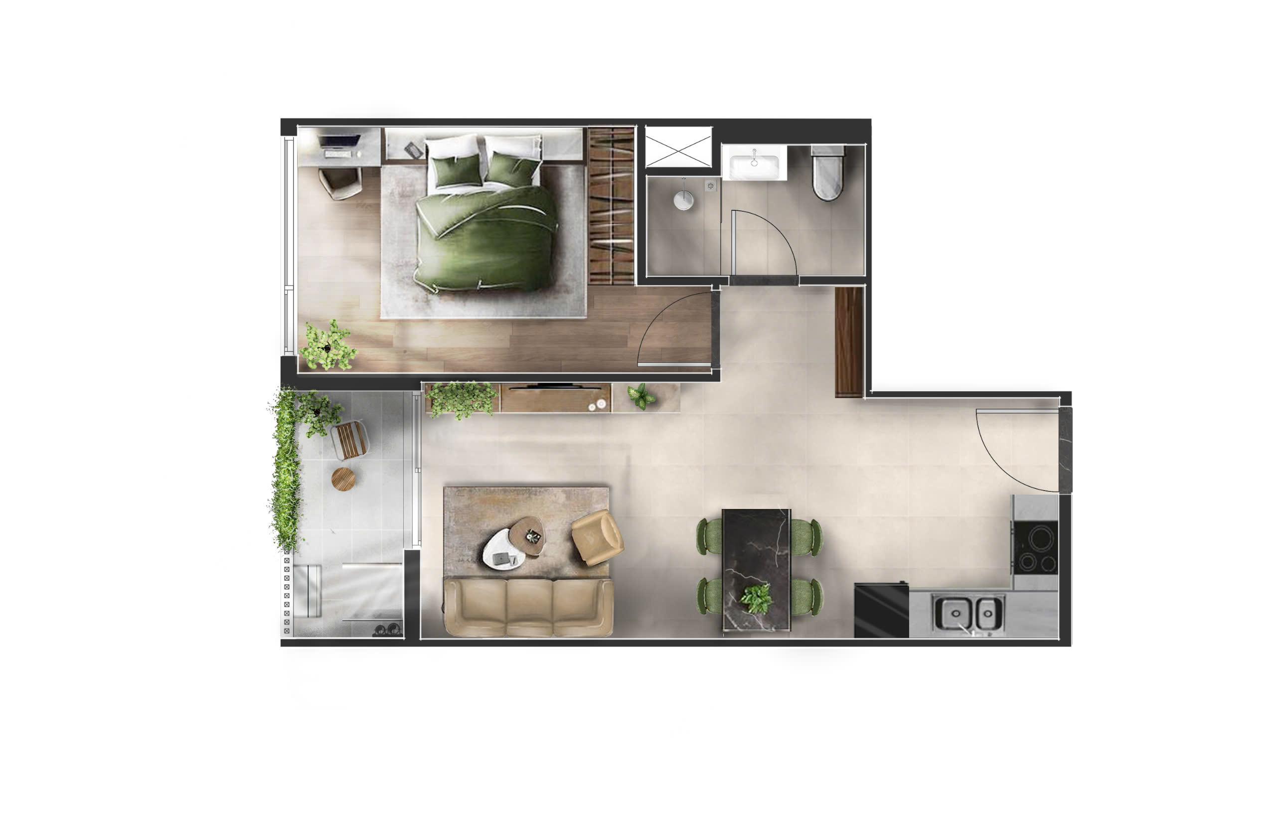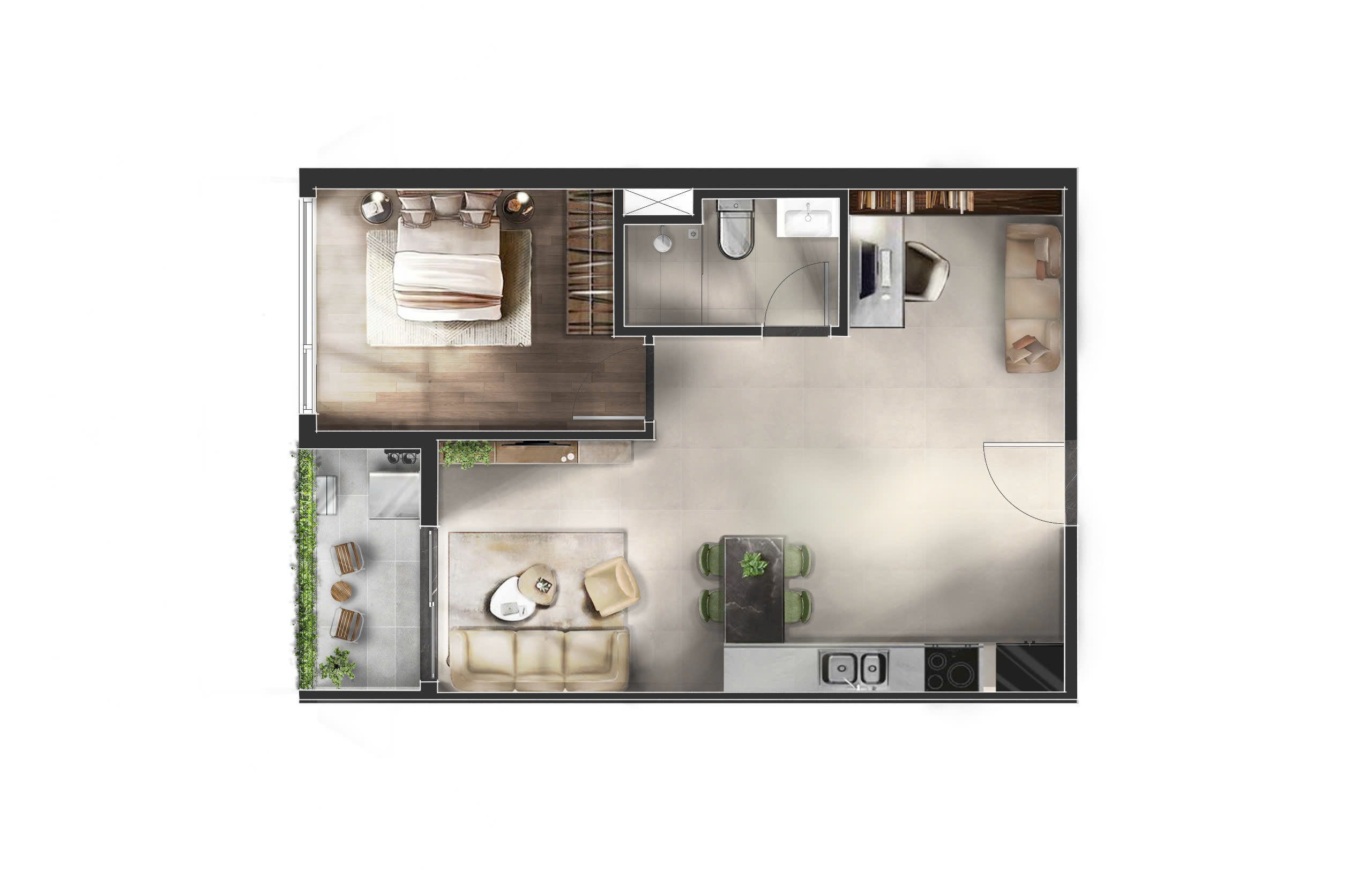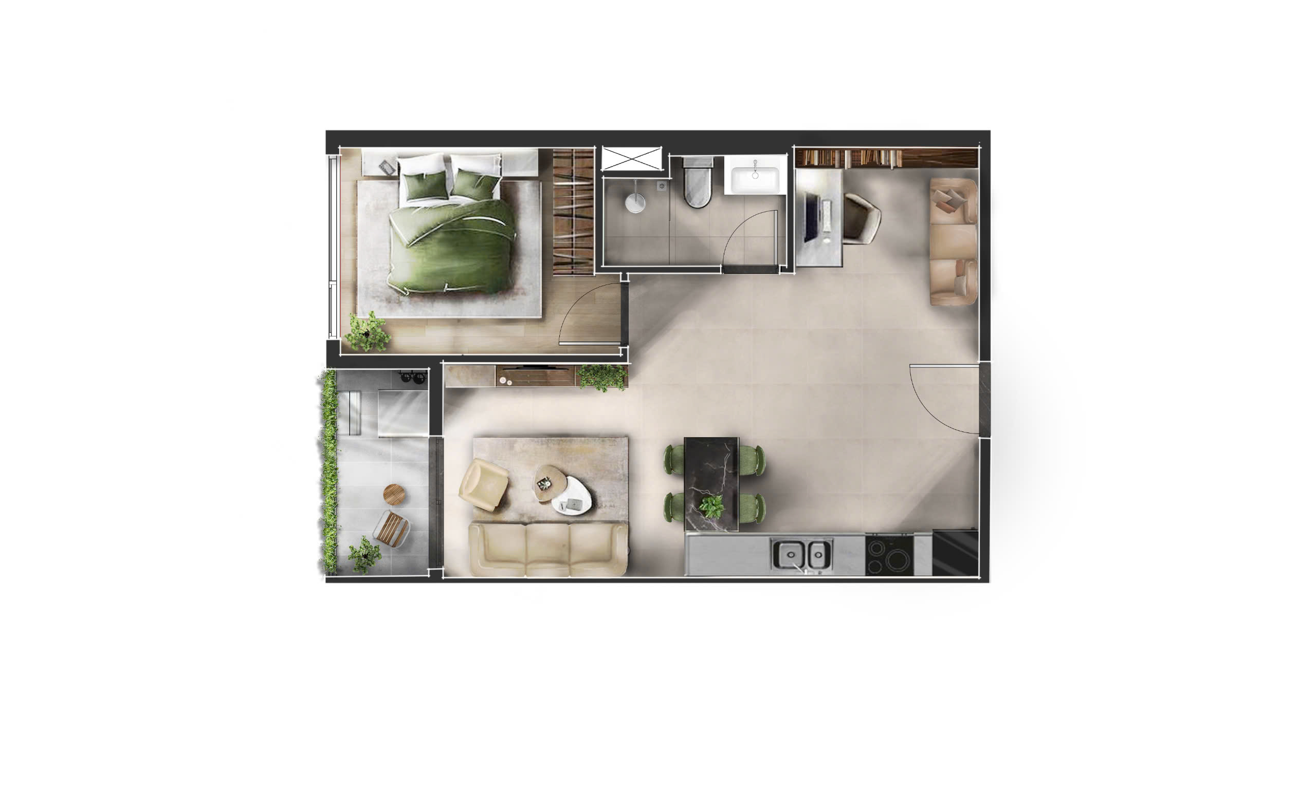 • Căn hộ 1PN+1: diện tích từ 50.4m² – 58.8m² được thiết kế kiến trúc giúp tối ưu hoá không gian sống và công năng sử dụng dành cho khách hàng độc thân hoặc các cặp đôi trẻ