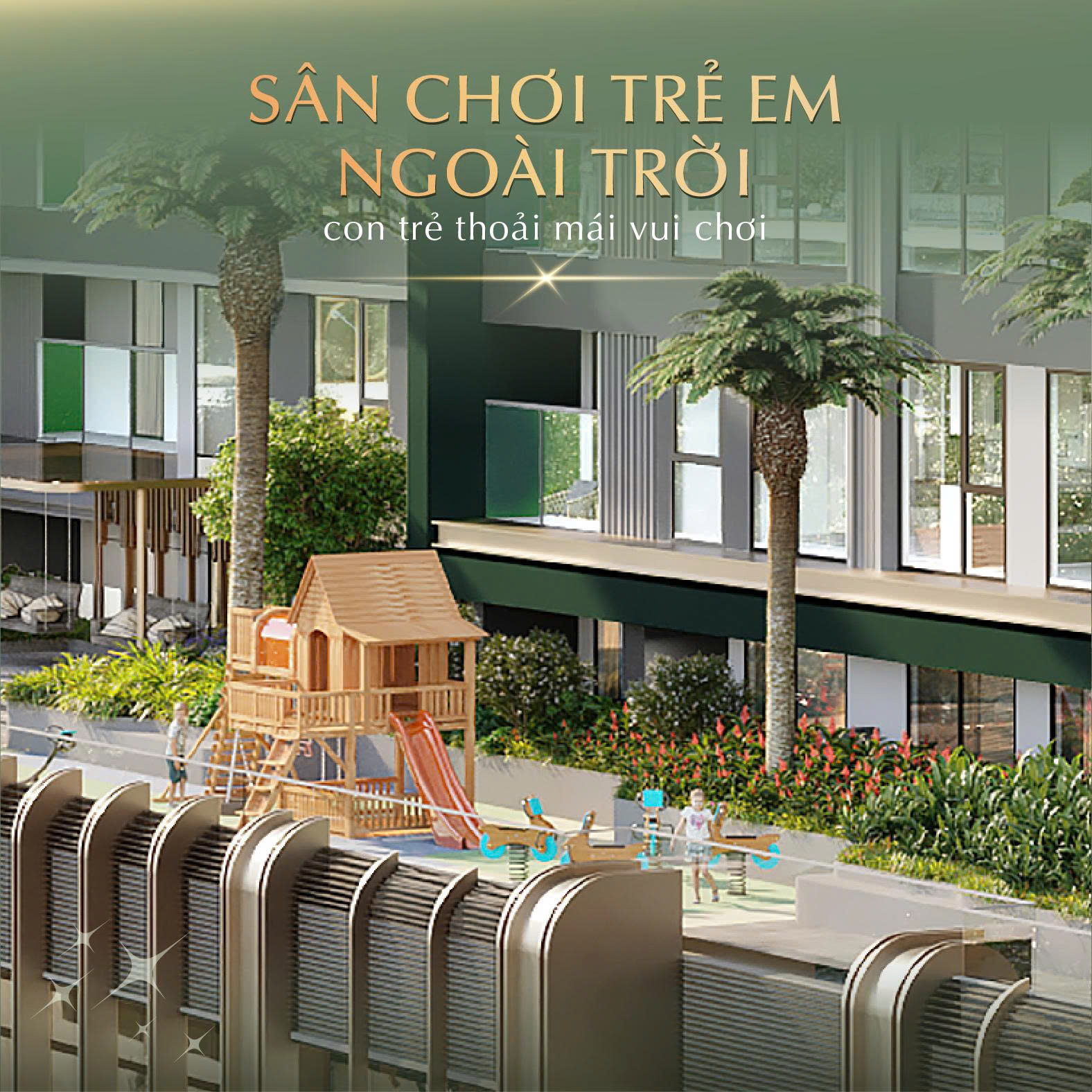 • Không gian cho trẻ em: Khu vui chơi trẻ em trong nhà và ngoài trời được thiết kế an toàn và sáng tạo.