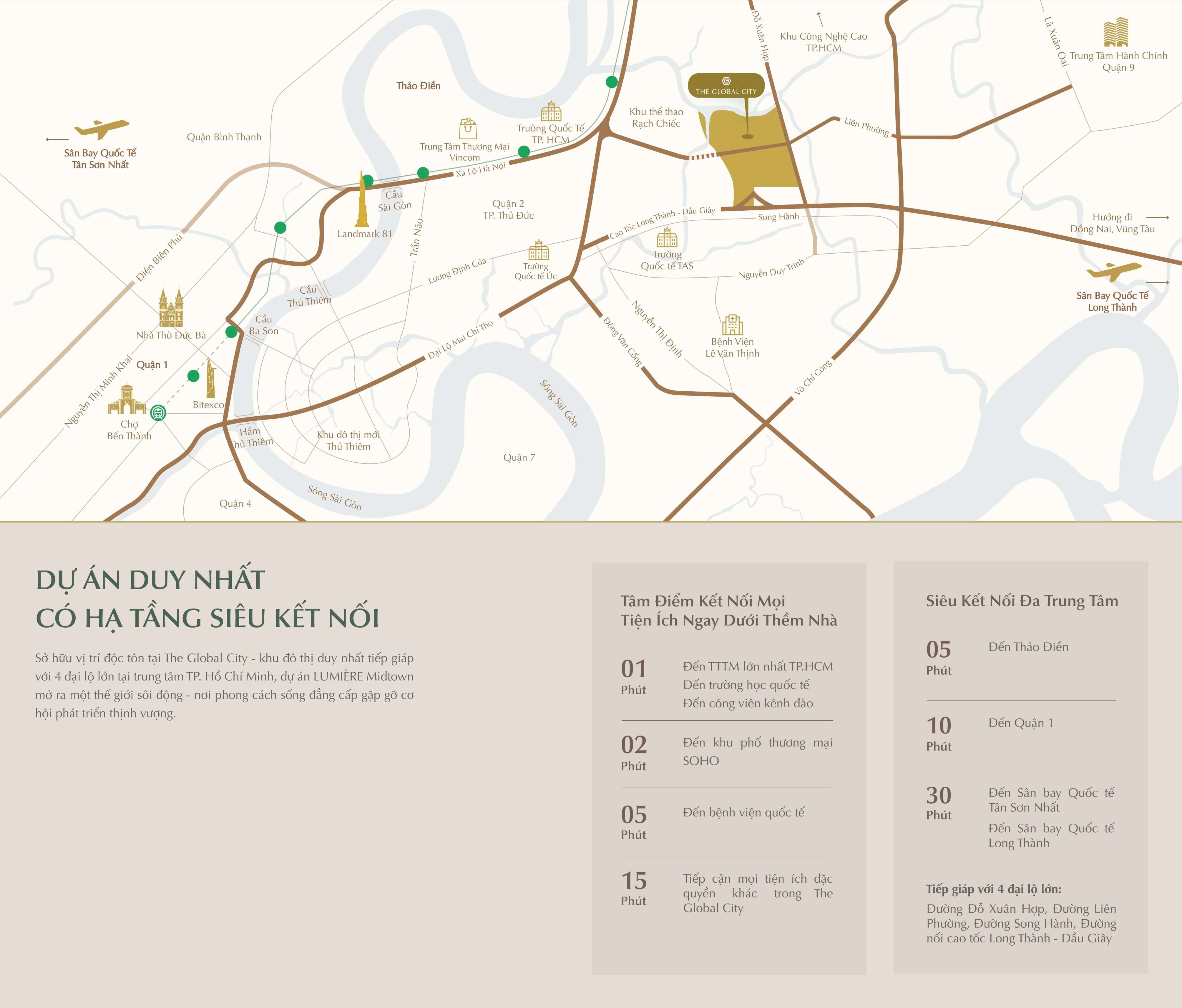 Đặc biệt, Lumiere Midtown Quận 2 còn được hưởng lợi từ hệ sinh thái tiện ích đẳng cấp của The Global City – “Downtown mới” của khu Đông Sài Gòn, bao gồm:
