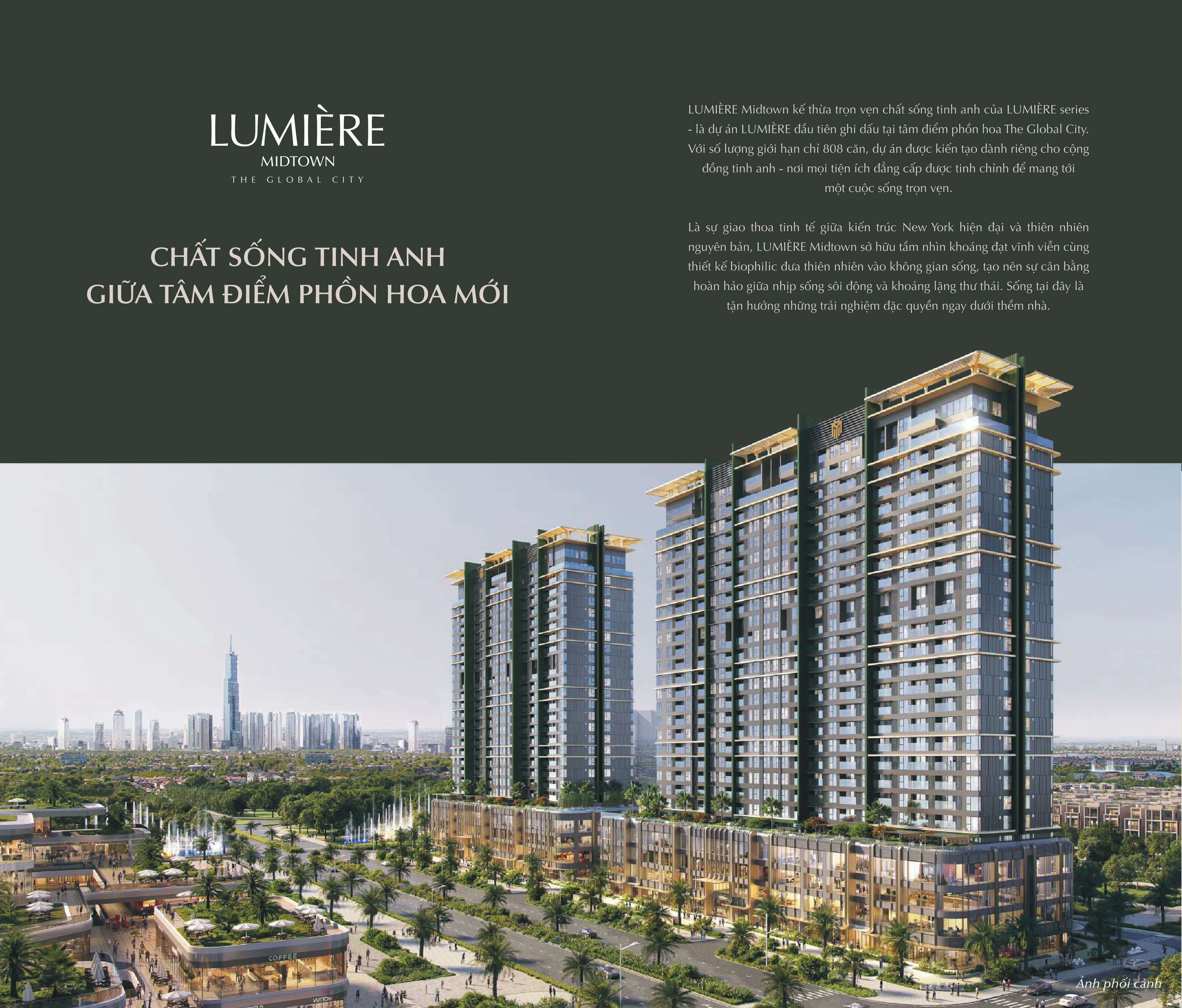 Dự án Lumière Midtown là một dự án căn hộ cao cấp thuộc khu đô thị The Global City, tọa lạc tại Quận 2, TP. Hồ Chí Minh. Được phát triển bởi Masterise Homes – thương hiệu gắn liền với những di sản sống chuẩn quốc tế, Lumiere Midtown chính là biểu tượng mà tôi tự hào sở hữu – nơi tôi tận hưởng tâm mạch phồn vinh, vươn tầm nhìn không giới hạn và kiến tạo giá trị vĩnh cửu. Dự án không chỉ mang đến không gian sống hiện đại mà còn tiên phong trong xu hướng kiến trúc xanh, giúp cư dân tận hưởng môi trường sống trong lành giữa lòng đô thị sôi động.