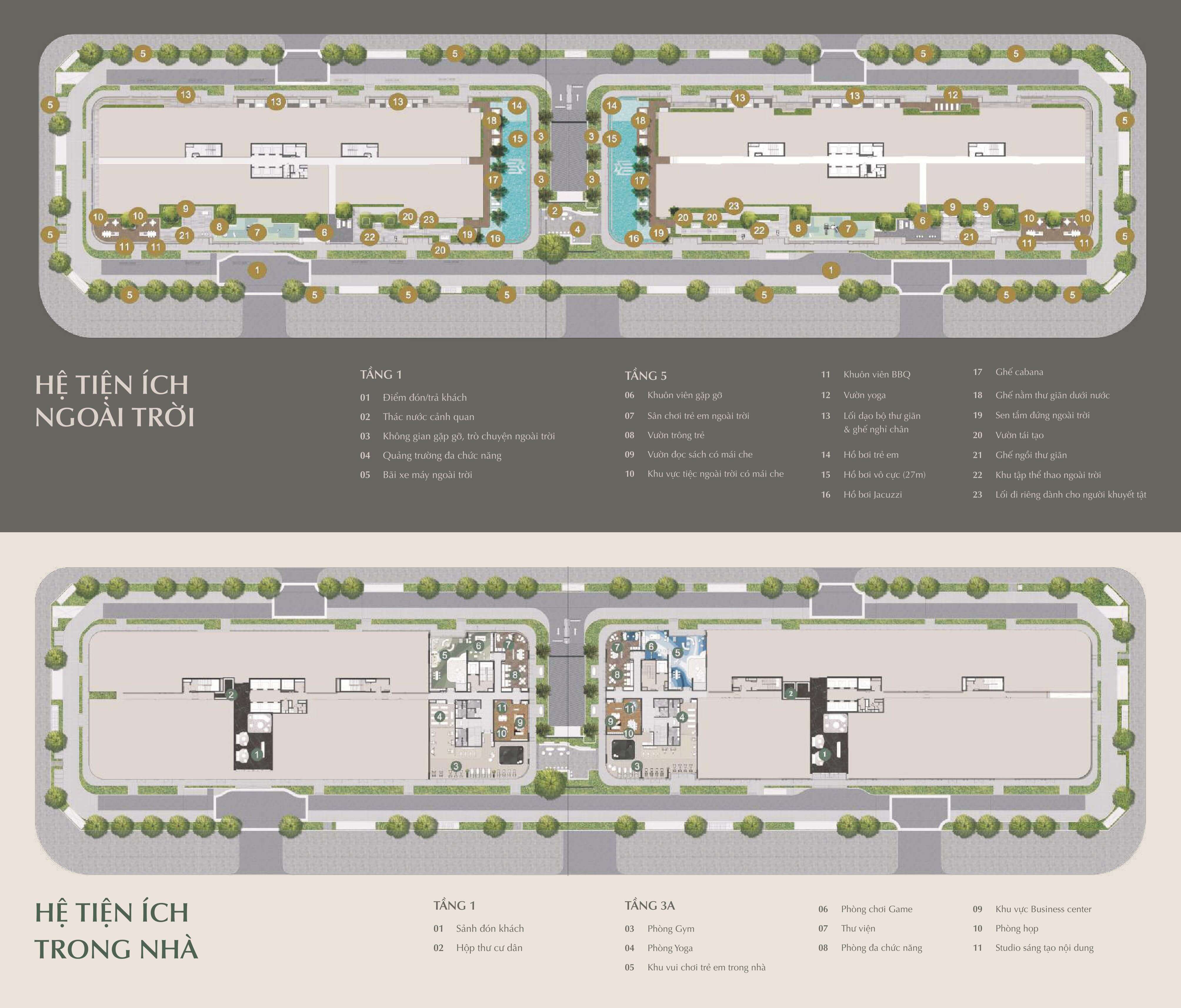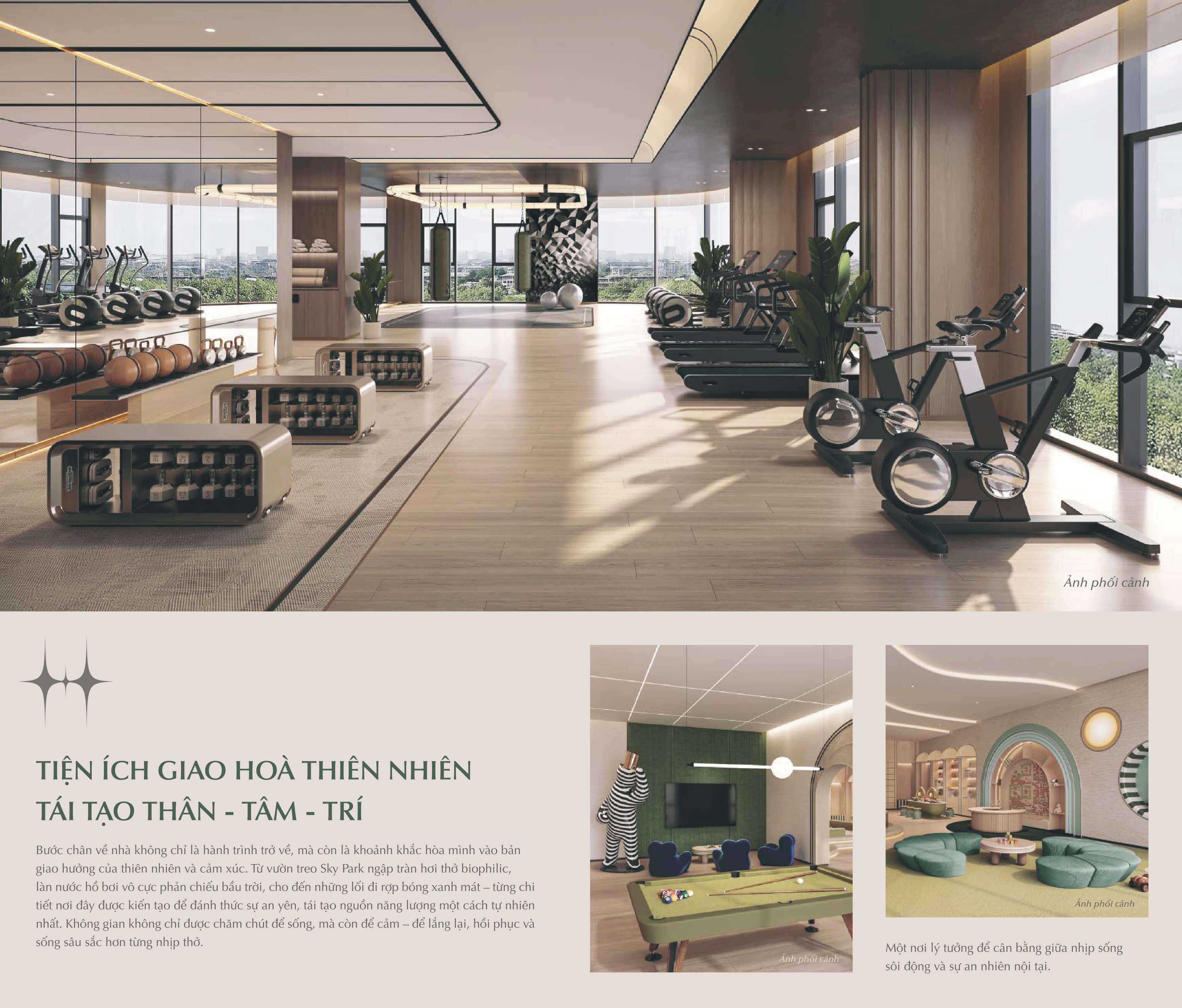 • Sức khỏe và thư giãn: Hồ bơi vô cực với tầm nhìn rộng mở, phòng gym – yoga trang bị đầy đủ thiết bị cao cấp, khu thư giãn ngoài trời, ghế tắm nắng, vườn thiền và góc cà phê yên tĩnh.