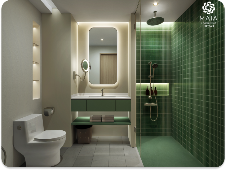 Maia Resort Hồ Tràm được kiến tạo bởi Dewan Architects + Engineers – đơn vị thiết kế danh tiếng quốc tế. Dự án nổi bật với phong cách thiết kế hiện đại, mang hơi thở thiên nhiên và tinh thần nghỉ dưỡng cao cấp.Các căn hộ được phối tông trắng và xanh lá chủ đạo, lấy cảm hứng từ khu rừng ánh kim ven biển. Nội thất sử dụng gỗ sáng, điểm xuyết ánh vàng nhẹ, kết hợp cùng hệ cửa kính lớn hướng biển, mang đến không gian sống sang trọng, gần gũi thiên nhiên và ngập tràn ánh sáng tự nhiên.Lối thiết kế này không chỉ tối ưu công năng, mà còn khơi gợi cảm giác thư thái và hài hòa – đúng chuẩn nghỉ dưỡng 5 sao.