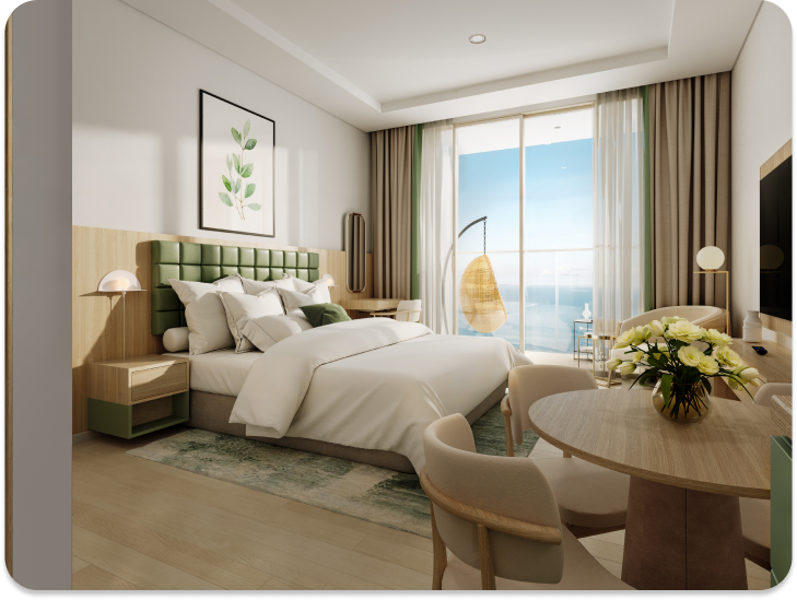Cửa kính lớn hướng biển hoặc rừng nguyên sinh, nội thất tinh tế, mang đậm phong cách nghỉ dưỡng chuẩn 5 sao. Đây là lựa chọn lý tưởng để trở thành ngôi nhà thứ hai hoặc tham gia chương trình cho thuê linh hoạt.
