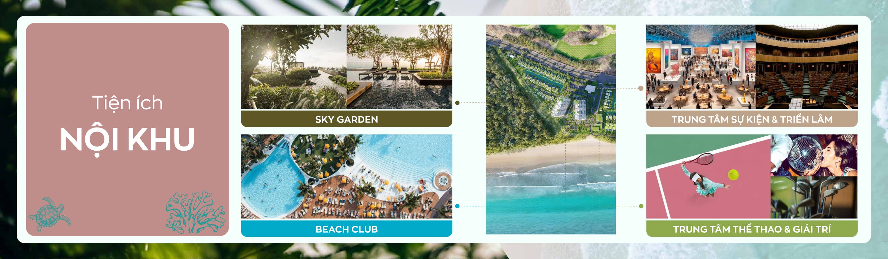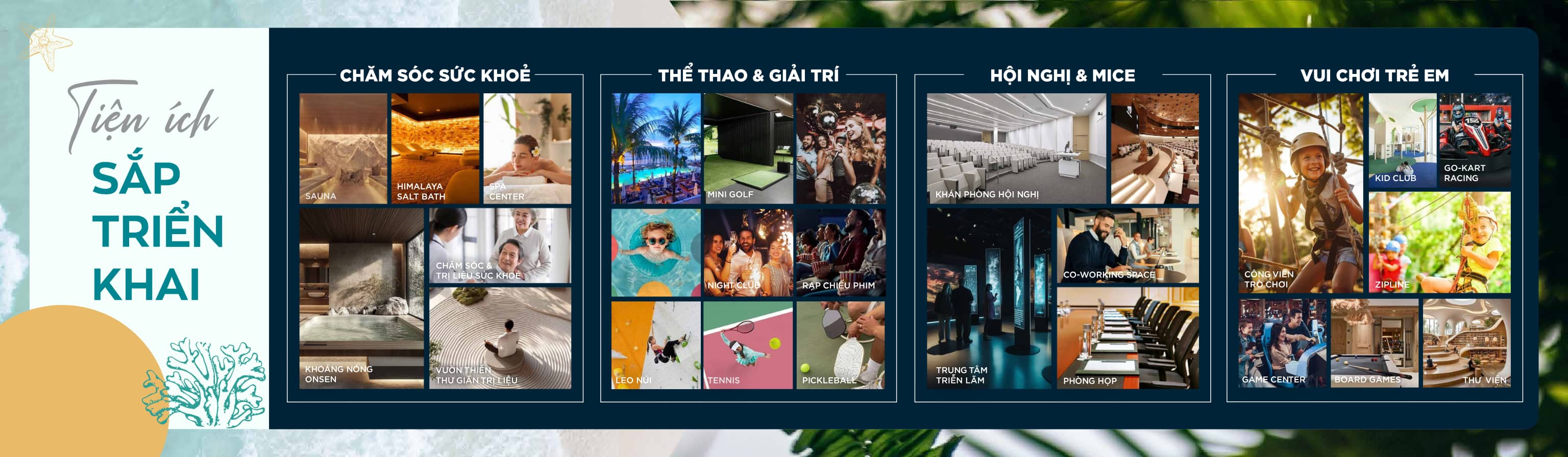 Gồm: Beach Club, nhà hàng biển, Food Court, trung tâm sự kiện – triển lãm, trung tâm phức hợp vui chơi – giải trí.