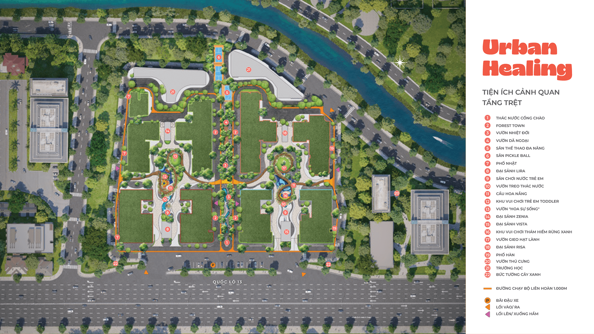 • Ngoài trời (Outdoor): khu công viên, sân chơi trẻ em, đường dạo bộ, hồ bơi ngoài trời… tạo môi trường gắn kết với thiên nhiên.